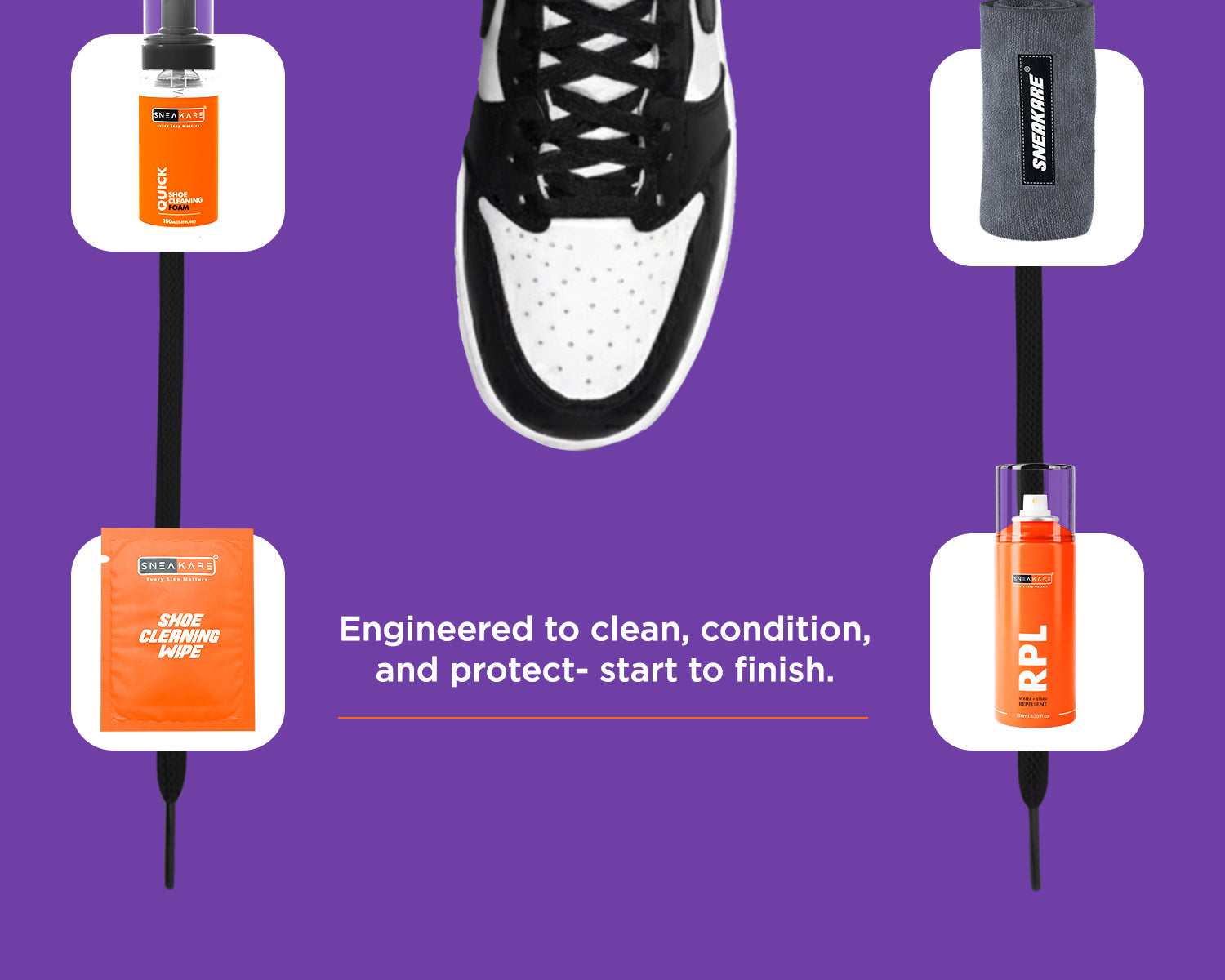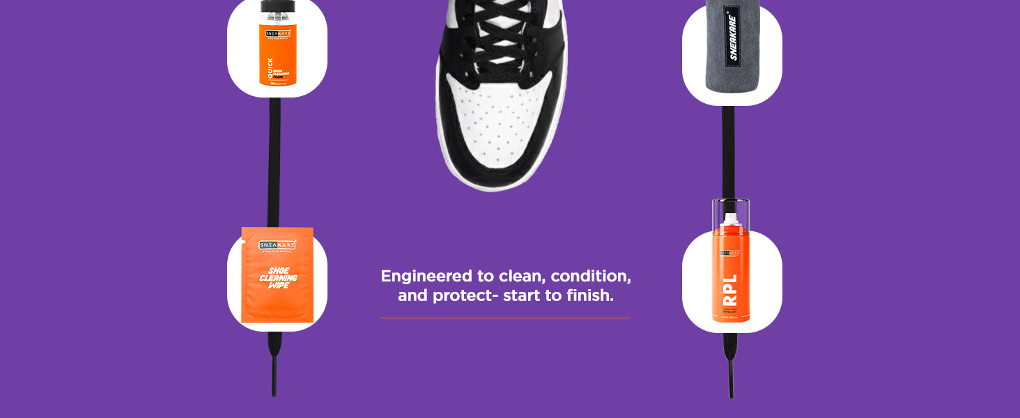 The kit includes: Quick Foam Cleaner 150 ml, RPL 100 ml spray, Microfiber Towel, Medium Brush, 6 Shoe Wipes, and 100 ml Shoe Cleaning Formula.