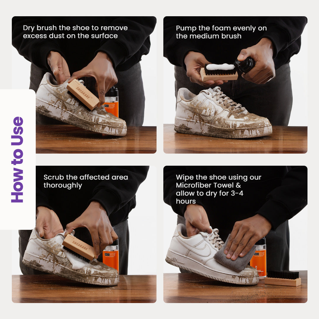 Dry-brush to remove dust → pump foam onto brush → scrub gently → wipe with cloth → air dry.