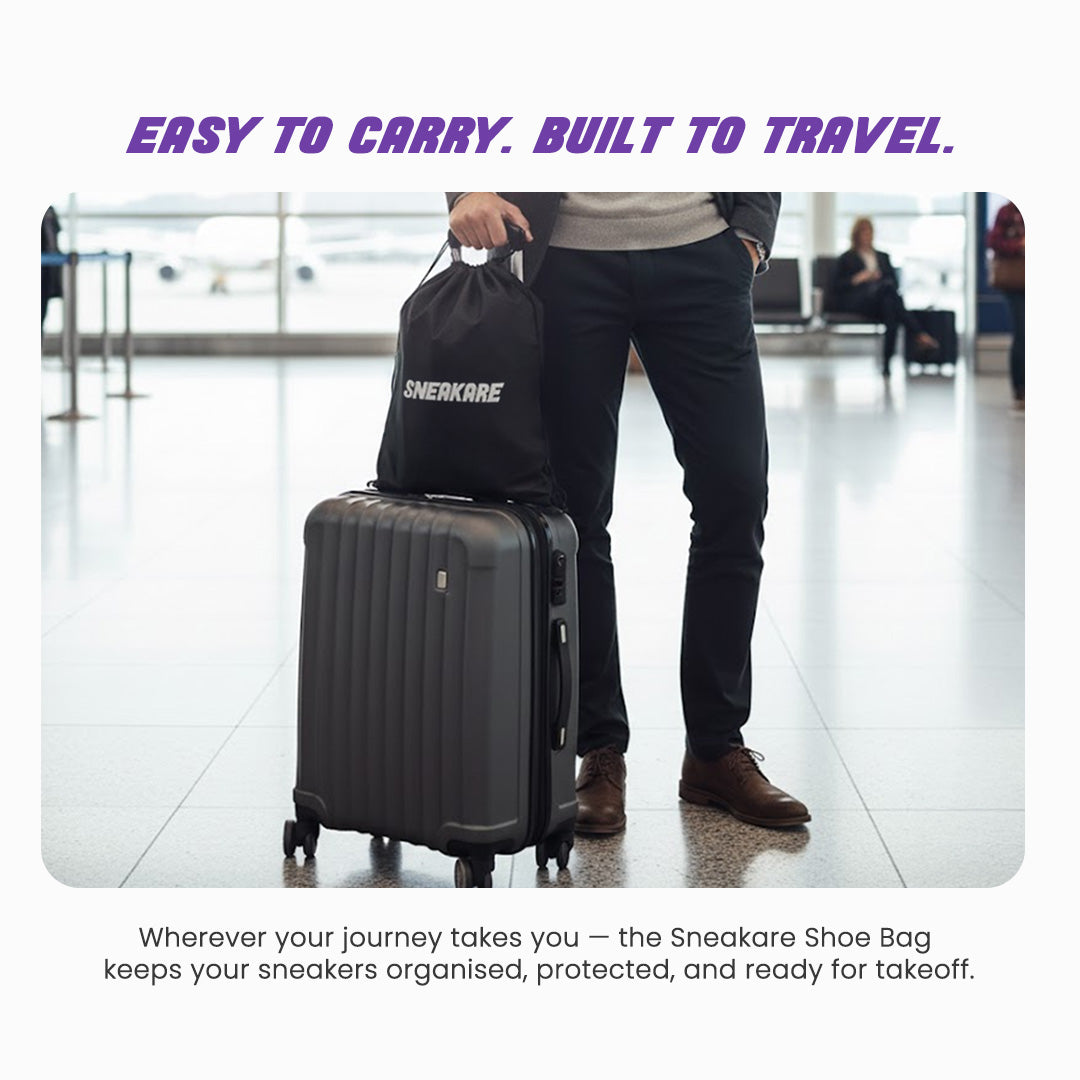 The Sneakare Travel Bag is designed to perfectly fit one pair of sneakers — up to UK size 12. This gives your shoes enough space to breathe, stay in shape, and remain protected during travel without squeezing or scuffing.